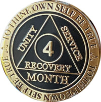 Celebrate 120 Days Of Sobriety With This 4 Month Aa Medallion In Glossy Elegant Black Color On Glossy Gold And Silver Plating. This Sobriety Coin Is 34X3Mm Which Is 1Mm Thicker Than Standard Chips For A Premium Weight And 'Feel'. Serenity Prayer Is On The Back Along The Coin Edge Is To Thine Own Self Be True But Its Recessed Into The Coin And Filled With Black Color. This Aa Chip Comes In A Protective Vinyl Envelope.