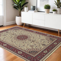 This 4-foot x 6-foot ivory red and blue oriental area rug, is a great way to add warmth to a room. Ideal for spaces with kids and pets, this rug is stain resistant to help repel dirt and spilled liquids. Built to last, this rug crafted from polypropylene fibers is known for its durability and long lasting appeal. Rugs are a great way to showcase your style, hide imperfections, warm your home and reduce noise. This smaller sized, traditional styled rug is just what you need for your walkway, bedside, in front of door, cabinet, refrigerator, or chair. 47.24-inch h x 70.87-inch w x 0.43-inch d.
