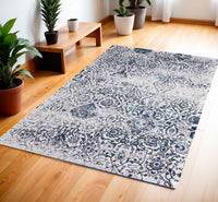 4' X 6' Navy Blue and Ivory Damask Distressed Area Rug