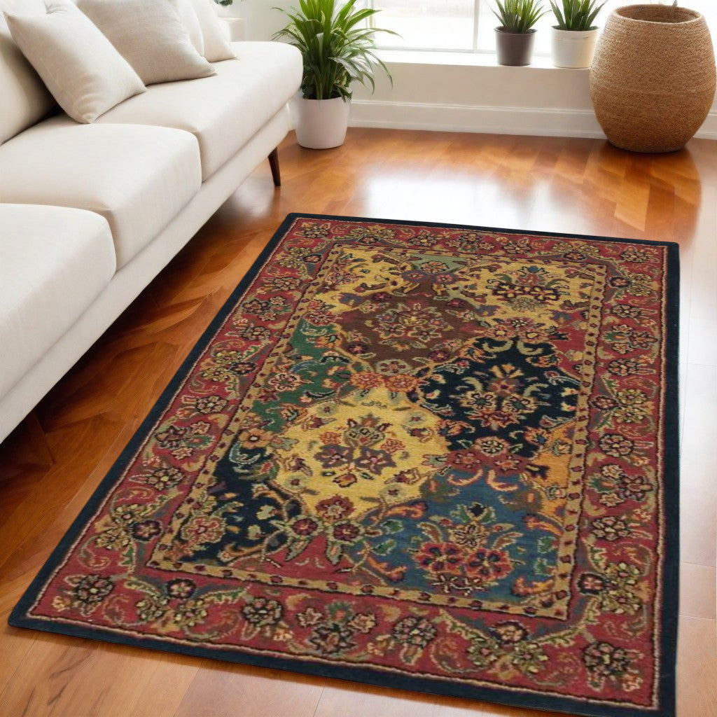 Add some artistry to your room with this 4-foot x 6-foot tan black and red wool floral area rug. Rugs are a great way to showcase your style, hide imperfections, warm your home and reduce noise. This smaller sized, traditional styled rug is just what you need for your walkway, bedside, in front of door, cabinet, refrigerator, or chair. 42-inch h x 66-inch w x 0.5-inch d