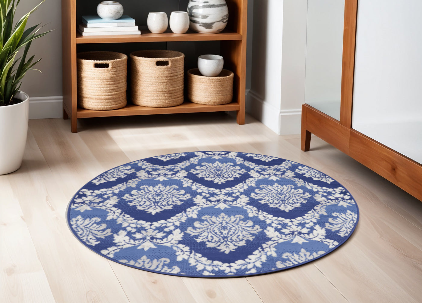 Add great coloration and comfortable texture to your space with this 5-foot ivory and blue damask distressed round rug. Ideal for spaces with kids and pets, this rug is stain resistant to help repel dirt and spilled liquids. Built to last, this rug crafted from polyester fibers is known for its durability and long lasting appeal. Rugs are a great way to showcase your style, hide imperfections, warm your home and reduce noise. This geometric round shaped rug features a damask pattern in ivory and blue that combines a good looking print with a unique and updated shape. The mix of shape, color, and design gives this rug refreshing visual interest. This larger sized, cottage styled rug is ready to create a focal point or statement piece in your room. 60-inch h x 60-inch w x 0.39-inch d.