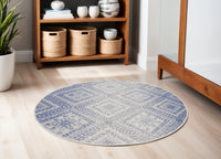 Set an inviting tone in your space with this 5-foot ivory and blue geometric distressed round rug. Ideal for spaces with kids and pets, this rug is stain resistant to help repel dirt and spilled liquids. Built to last, this rug crafted from polyester fibers is known for its durability and long lasting appeal. Rugs are a great way to showcase your style, hide imperfections, warm your home and reduce noise. This geometric round shaped rug features a geometric pattern in ivory and blue that combines a good looking print with a unique and updated shape. The mix of shape, color, and design gives this rug refreshing visual interest. This larger sized, bohemian styled rug is ready to create a focal point or statement piece in your room. 60-inch h x 60-inch w x 0.39-inch d.