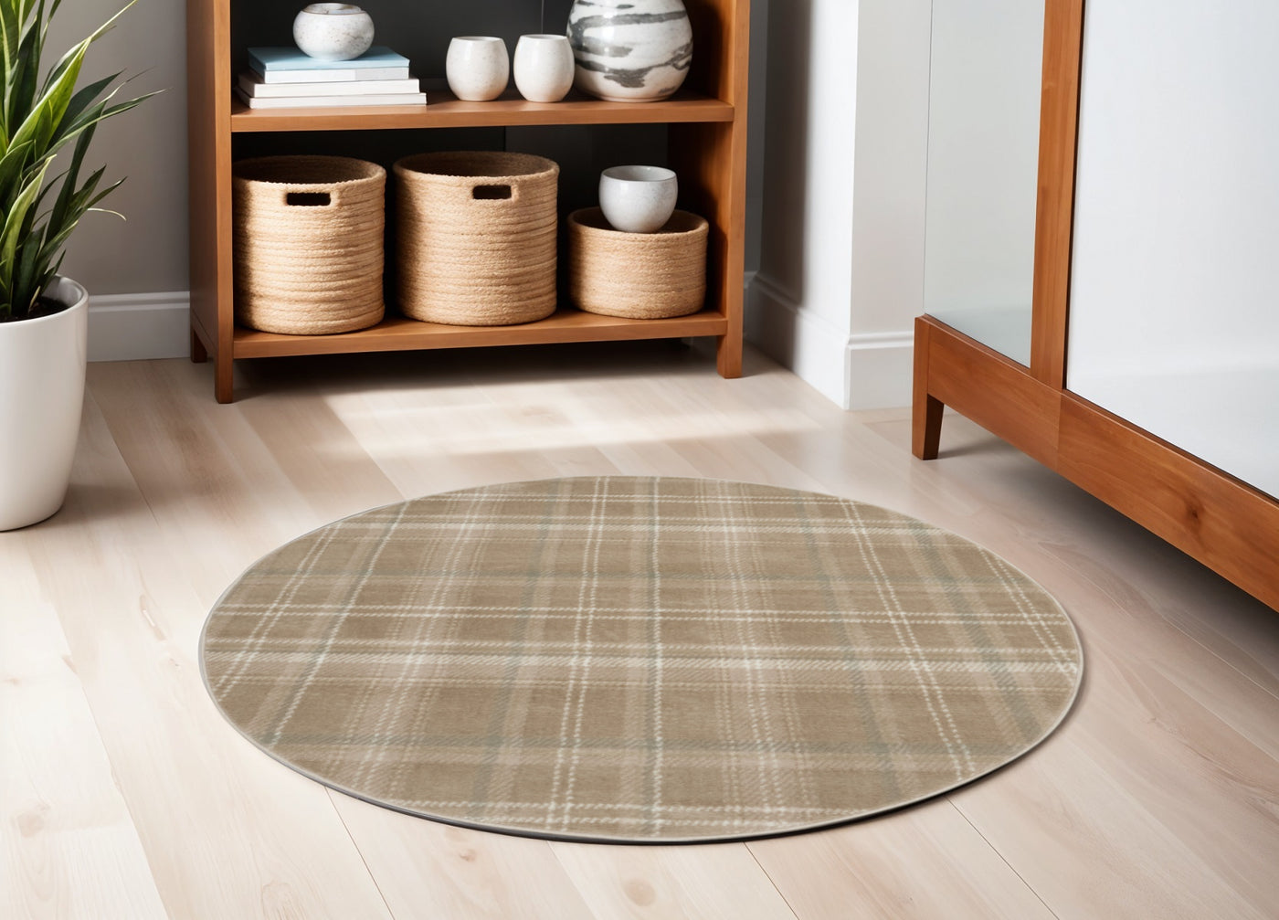 Add great coloration and comfortable texture to your space with this 5-foot taupe and ivory plaid round rug. Ideal for spaces with kids and pets, this rug is stain resistant to help repel dirt and spilled liquids. Built to last, this rug crafted from polypropylene fibers is known for its durability and long lasting appeal. Rugs are a great way to showcase your style, hide imperfections, warm your home and reduce noise. This geometric round shaped rug features a plaid pattern in taupe that combines a good looking print with a unique and updated shape. The mix of shape, color, and design gives this rug refreshing visual interest. This larger sized, country styled rug is ready to create a focal point or statement piece in your room. 63-inch h x 63-inch w x 0.5-inch d