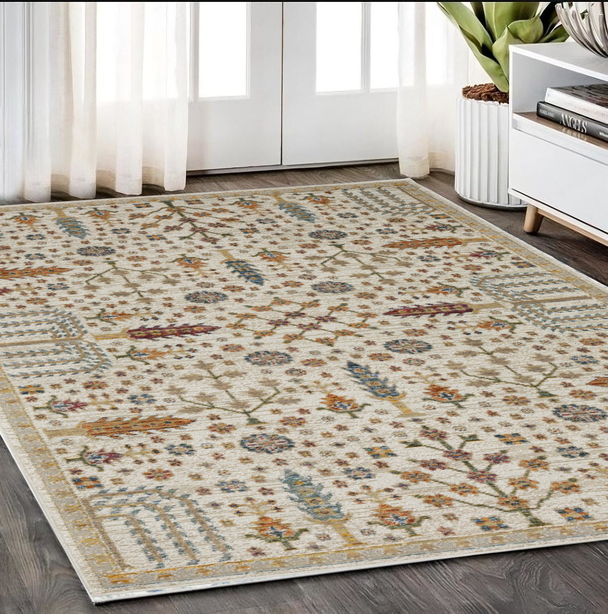 This 5-foot x 7-foot ivory oriental power loom area rug, is a great way to add warmth to a room. This rectangle shaped rug features a oriental design in ivory to give it visual interest. A classic shape marries with good looking design for your space the coloring of this rug adds a delightfully neutral tone to your home and will easily match with most any decor. Ideal for spaces with kids and pets, this rug is stain resistant to help repel stains and spilled liquids. Place this area rug against a hardwood or tile floor and it will enliven your living space with style and sophistication. 62.99-inch H x 90.55-inch W x 0.55-inch D