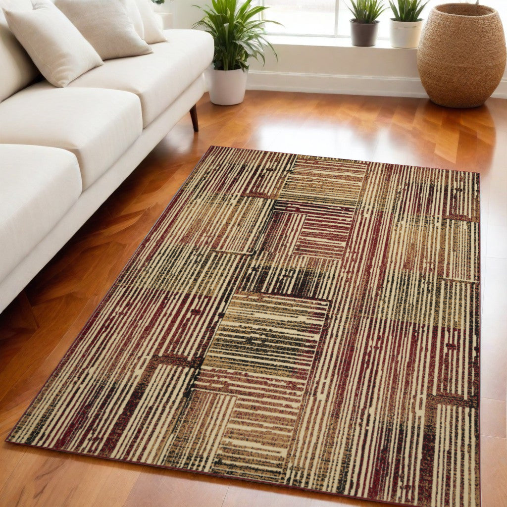 5' X 7' Tan Black and Red Striped Non Skid Area Rug
