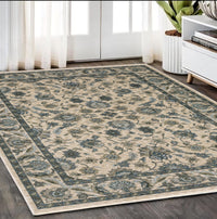 5' X 8' Beige And Blue Oriental Area Rug With Fringe