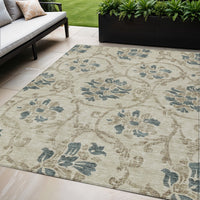 5' X 8' Beige Tan And Blue Floral Washable Indoor Outdoor Area Rug