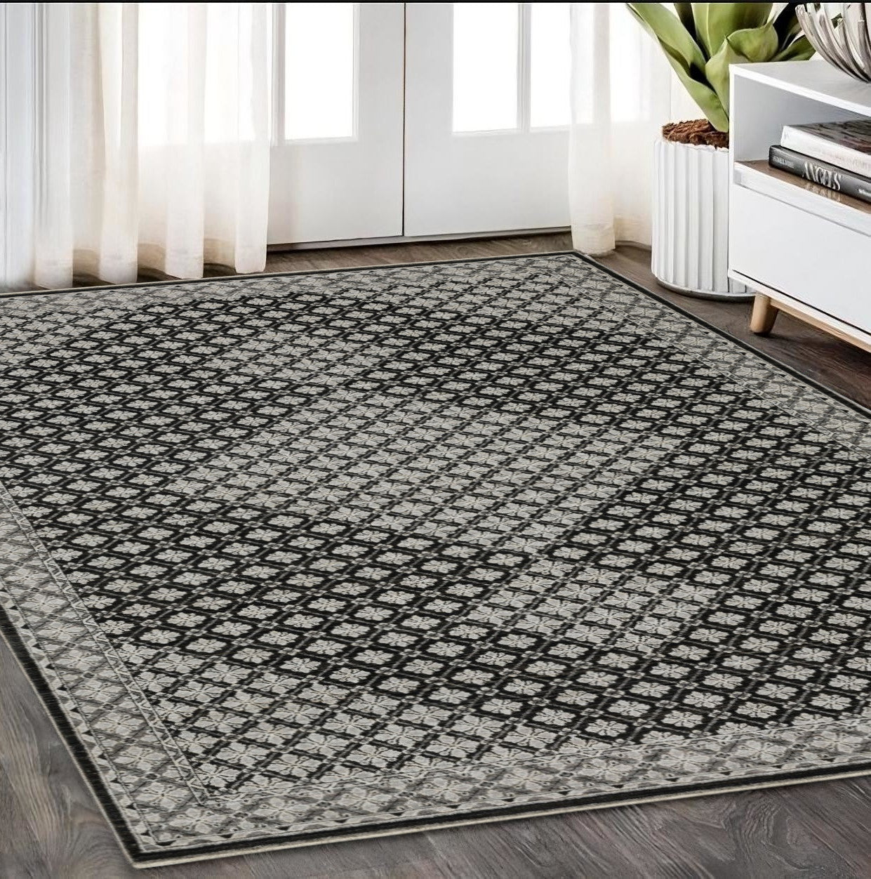Add great coloration and comfortable texture to your space with this 5-foot x 8-foot black diamond power loom area rug with fringe. This rectangle shaped rug features a diamond design in black to give it visual interest. A classic shape marries with good looking design for your space the coloration of this rug infuses an updated and modern vibe into your space. Ideal for spaces with kids and pets, this rug is stain resistant to help repel stains and spilled liquids. Tassel ends bring a timeless and fashionable look to your interior. Area rugs help to give warmth and sense of home to your space. 62.99-inch H x 92.52-inch W x 0.32-inch D