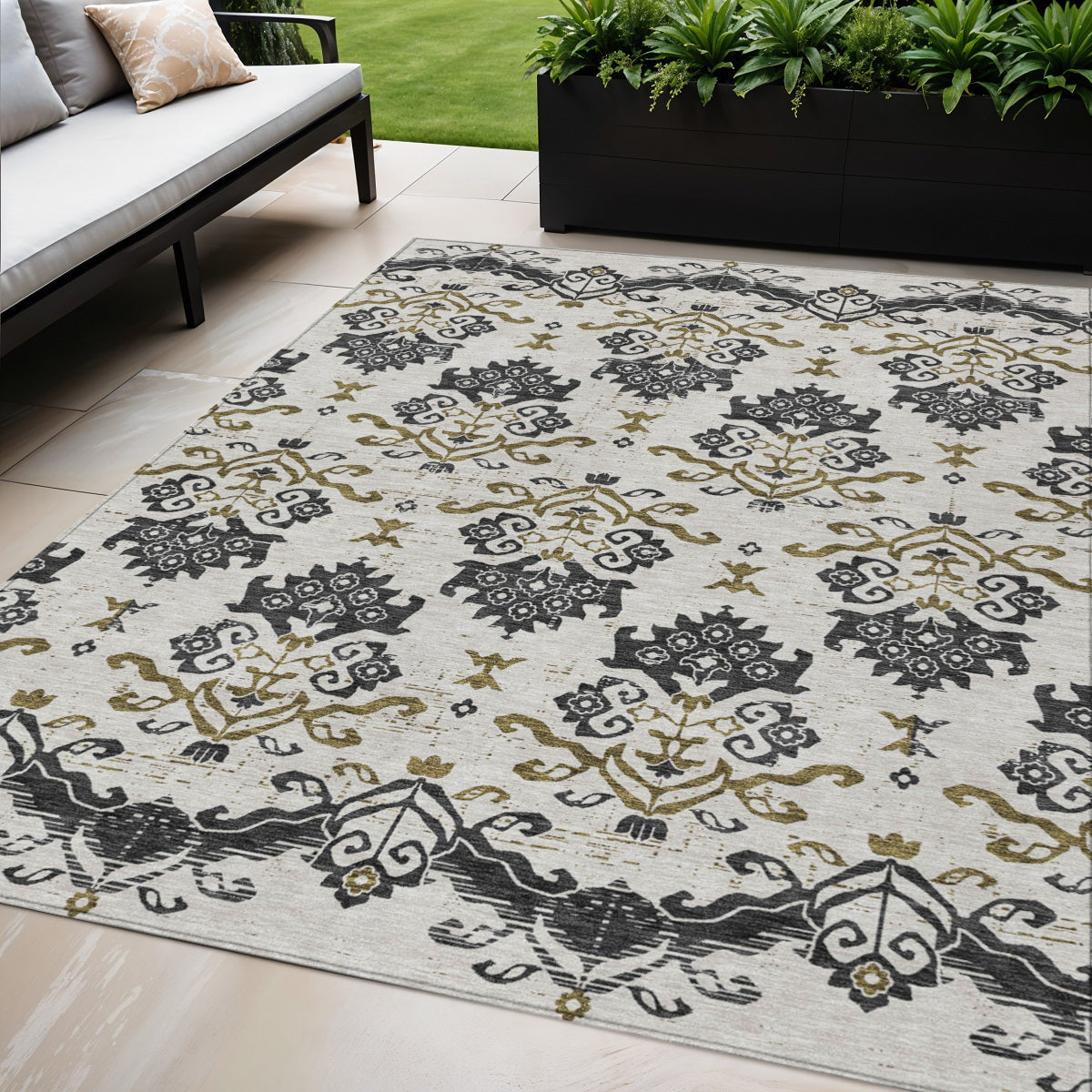 Set an inviting tone in your space with this 5-foot x 8-foot black beige and gold oriental washable indoor outdoor area rug. This rectangle shaped rug features a oriental design that will work well both indoors or out. A classic shape marries with good looking design for your living room, hall, bedroom, porch, patio, or poolside. The coloration of this rug infuses an updated and modern vibe into your space. Ideal for outdoor spaces or high traffic areas with kids and pets, this rug is made from heavy duty polyester that is stain resistant to help repel water, dirt, and stains. Versatile in use, durable, and easy to maintain, this rug is an ideal solution to add a decorative and inviting touch to your indoor or outdoor space. 60-inch h x 90-inch w x 0.19-inch d.
