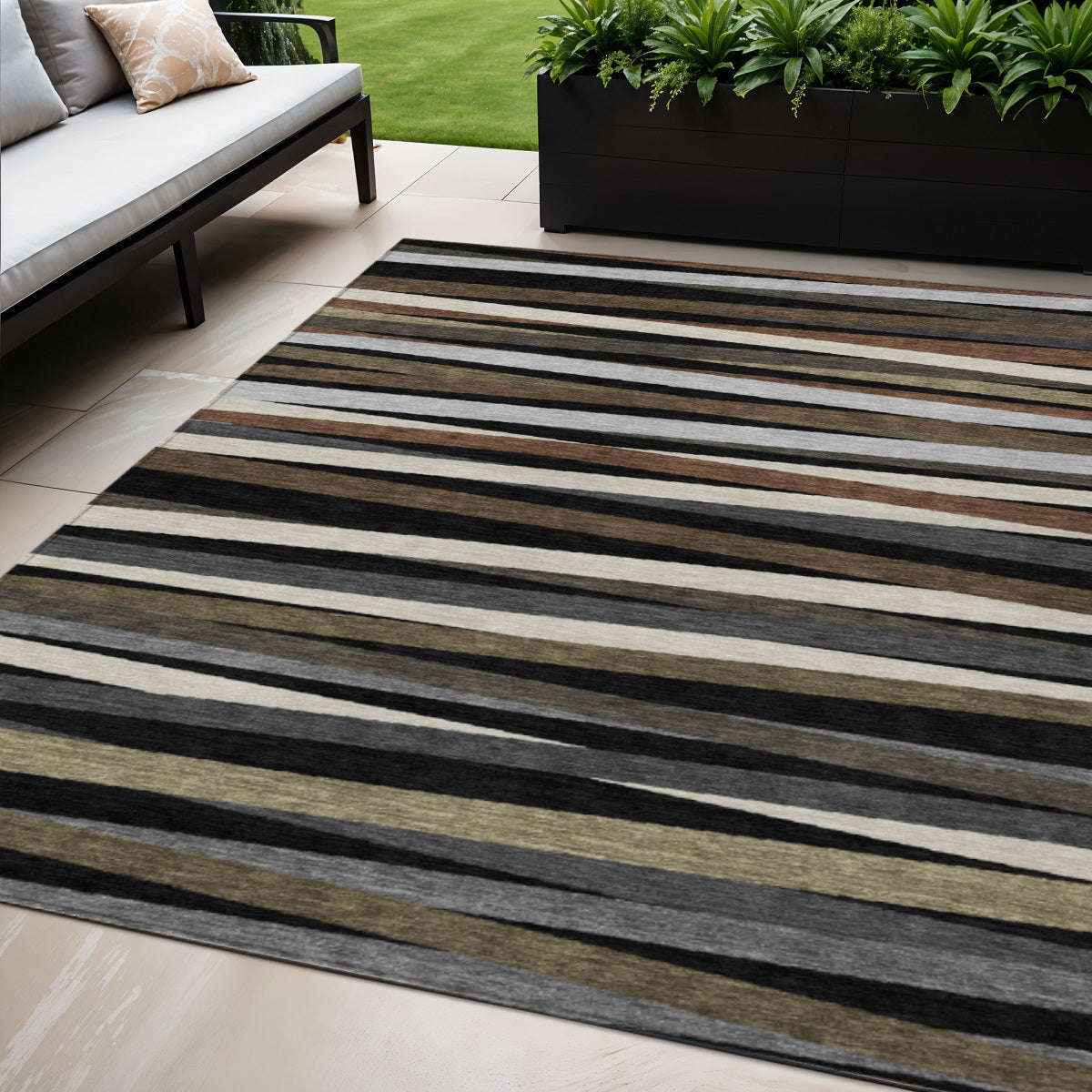 5' X 8' Black Brown And Ivory Striped Washable Indoor Outdoor Area Rug
