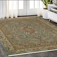 Add great coloration and comfortable texture to your space with this 5-foot x 8-foot blue medallion power loom area rug with fringe. This rectangle shaped rug features a medallion design in blue to give it visual interest. A classic shape marries with good looking design for your space ideal for spaces with kids and pets, this rug is stain resistant to help repel stains and spilled liquids. Tassel ends bring a timeless and fashionable look to your interior. Place this area rug against a hardwood or tile floor and it will enliven your living space with style and sophistication. 62.99-inch H x 90.55-inch W x 0.16-inch D