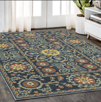 Set an inviting tone in your space with this 5-foot x 8-foot blue medallion power loom area rug with fringe. This rectangle shaped rug features a medallion design in blue to give it visual interest. A classic shape marries with good looking design for your space ideal for spaces with kids and pets, this rug is stain resistant to help repel stains and spilled liquids. Tassel ends bring a timeless and fashionable look to your interior. Area rugs help to give warmth and sense of home to your space. 62.99-inch H x 92.52-inch W x 0.32-inch D