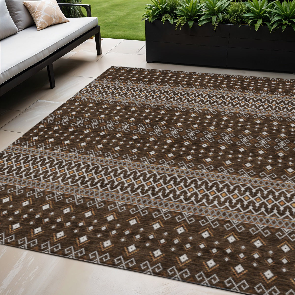 Add great coloration and comfortable texture to your space with this 5-foot x 8-foot chocolate taupe and copper tribal washable indoor outdoor area rug. This rectangle shaped rug features a tribal design that will work well both indoors or out. A classic shape marries with good looking design for your living room, hall, bedroom, porch, patio, or poolside. Ideal for outdoor spaces or high traffic areas with kids and pets, this rug is made from heavy duty polyester that is stain resistant to help repel water, dirt, and stains. Makes a great way to dress up your patio, porch, or poolside, but also works well as a durable and easy to maintain option in the kitchen, family room, or mudroom. 60-inch h x 90-inch w x 0.19-inch d.