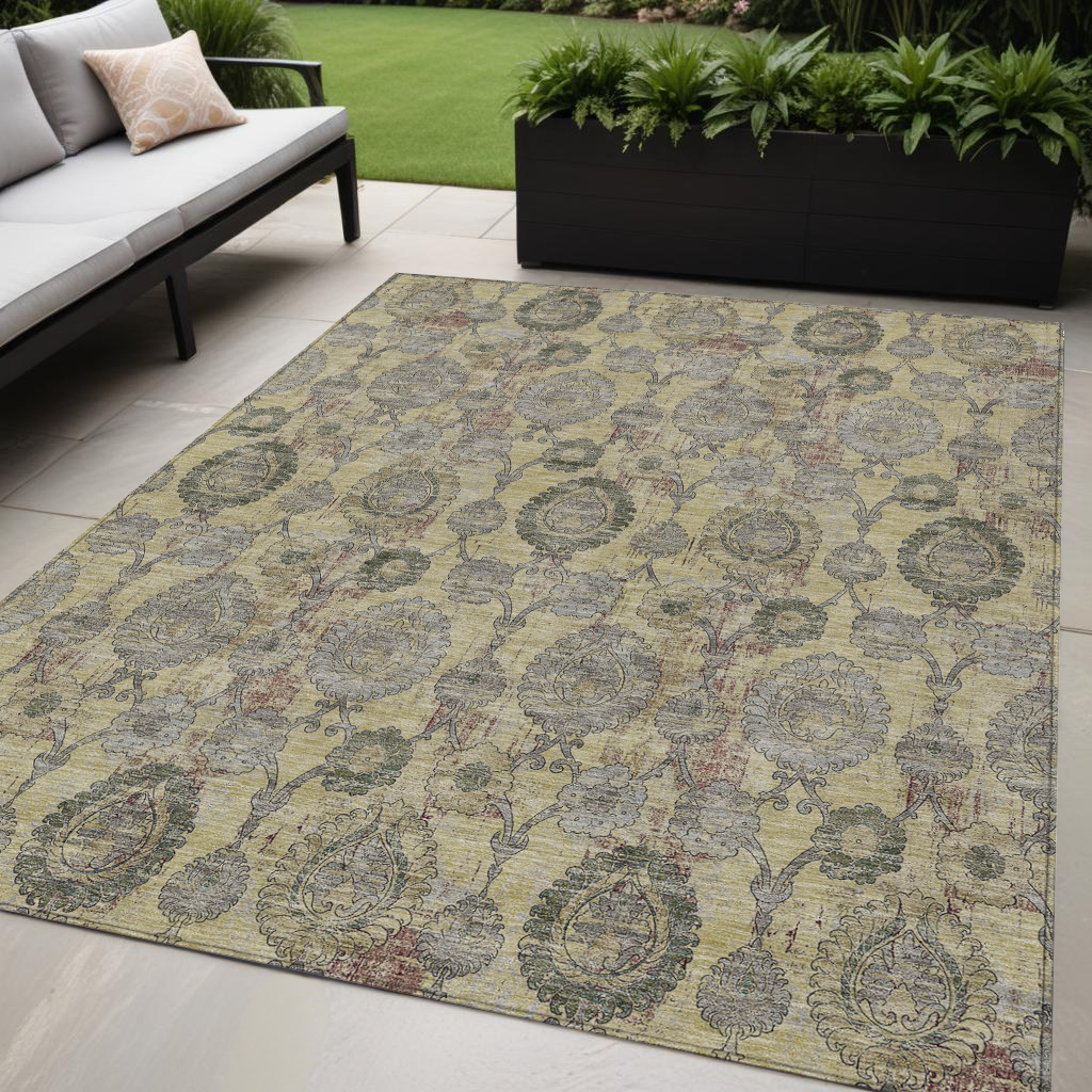 5' X 8' Gold Gray And Charcoal Damask Washable Indoor Outdoor Area Rug