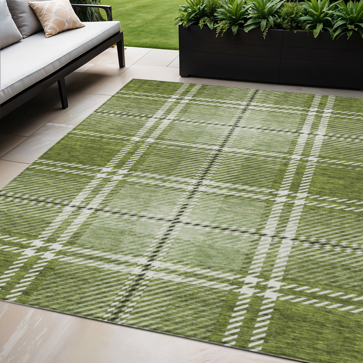 5' X 8' Green Black And Ivory Plaid Washable Indoor Outdoor Area Rug