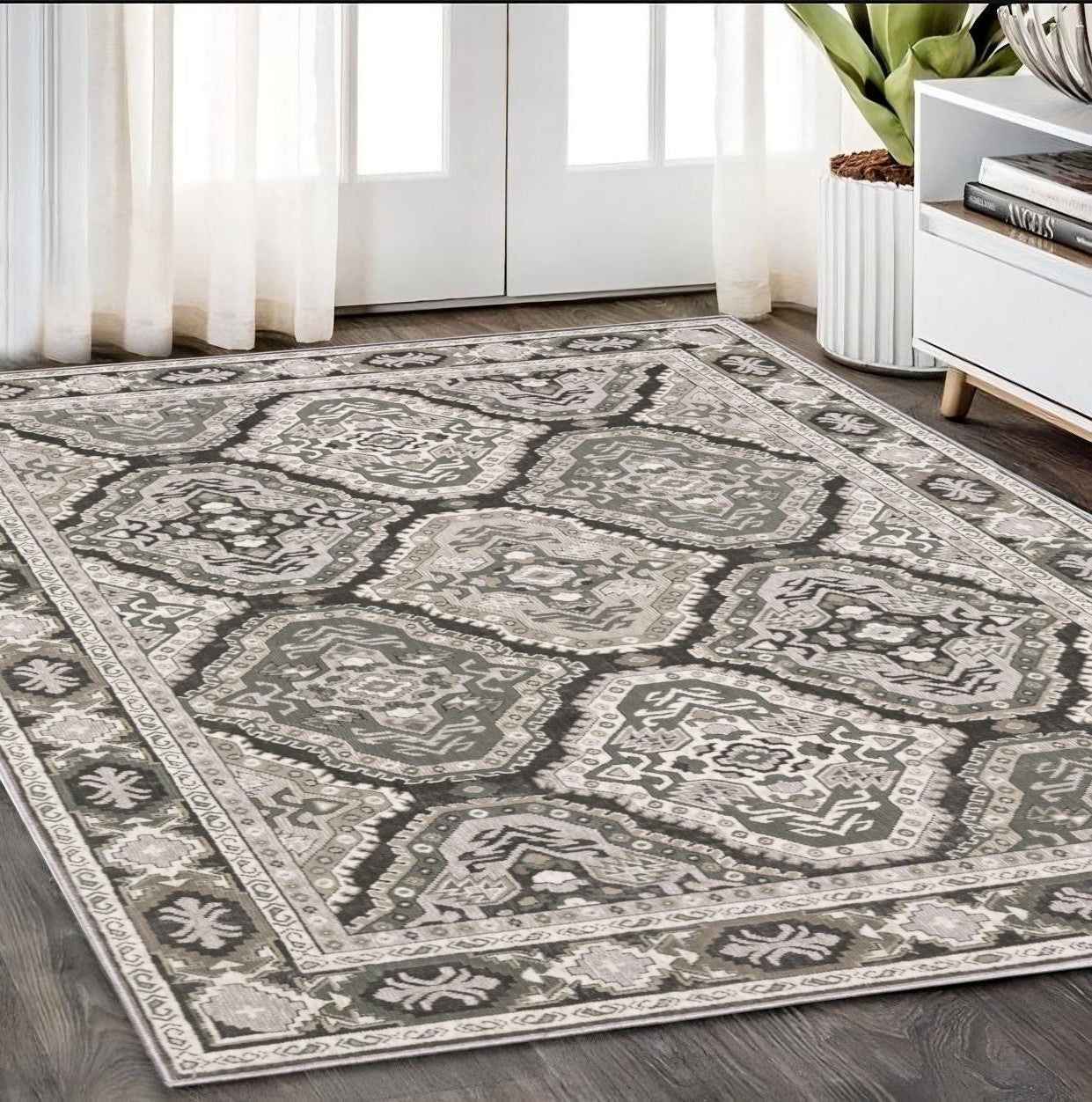 Add some artistry to your room with this 5-foot x 8-foot ivory medallion power loom area rug. This rectangle shaped rug features a medallion design in ivory to give it visual interest. A classic shape marries with good looking design for your space the coloring of this rug adds a delightfully neutral tone to your home and will easily match with most any decor. Ideal for spaces with kids and pets, this rug is stain resistant to help repel stains and spilled liquids. Area rugs help to give warmth and sense of home to your space. 62.99-inch H x 92.52-inch W x 0.39-inch D