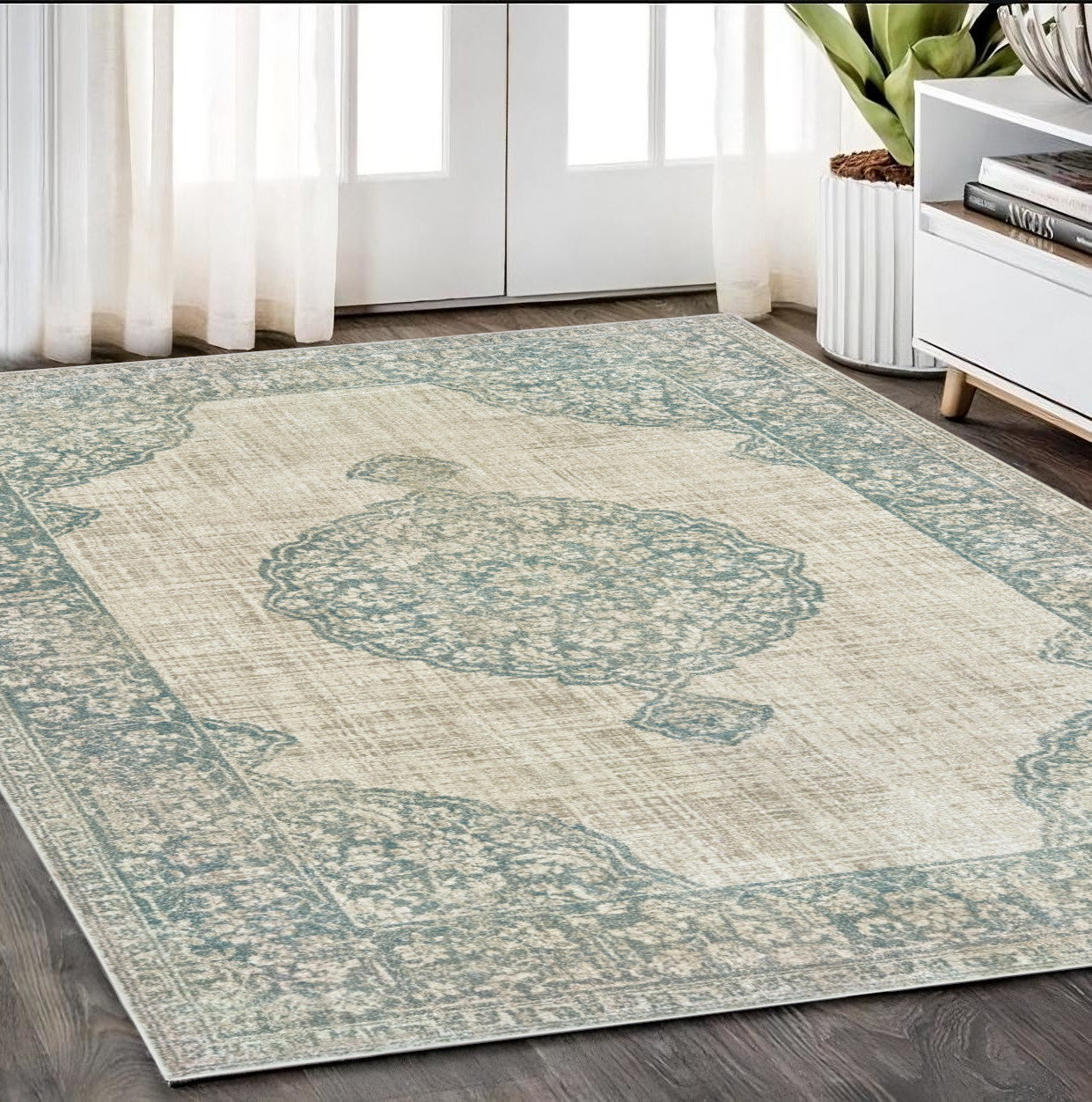 5' X 8' Ivory And Blue Oriental Distressed Area Rug