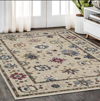 Add great coloration and comfortable texture to your space with this 5-foot x 8-foot ivory floral power loom area rug with fringe. This rectangle shaped rug features a floral design in ivory to give it visual interest. A classic shape marries with good looking design for your space the coloring of this rug adds a delightfully neutral tone to your home and will easily match with most any decor. Ideal for spaces with kids and pets, this rug is stain resistant to help repel stains and spilled liquids. Tassel ends bring a timeless and fashionable look to your interior. Area rugs help to give warmth and sense of home to your space. 62.99-inch H x 92.52-inch W x 0.28-inch D