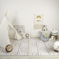 Set an inviting tone in your space with this 5-foot x 8-foot ivory blue and yellow juvenile rainbows youthful area rug. Features the perfect playful pattern that is ideal for child's bedroom, nursery, playroom, or den. This rectangle shaped rug features a youthful design in ivory blue and yellow to give it visual interest. Ideal for spaces with kids and pets, this rug is stain resistant to help repel stains and spilled liquids. 63-inch H x 91-inch W x 0.4-inch D