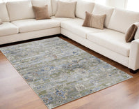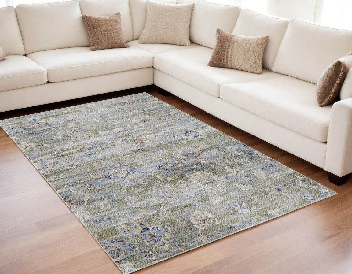 5' X 8' Ivory Green and Blue Floral Power Loom Worn Faded Area Rug