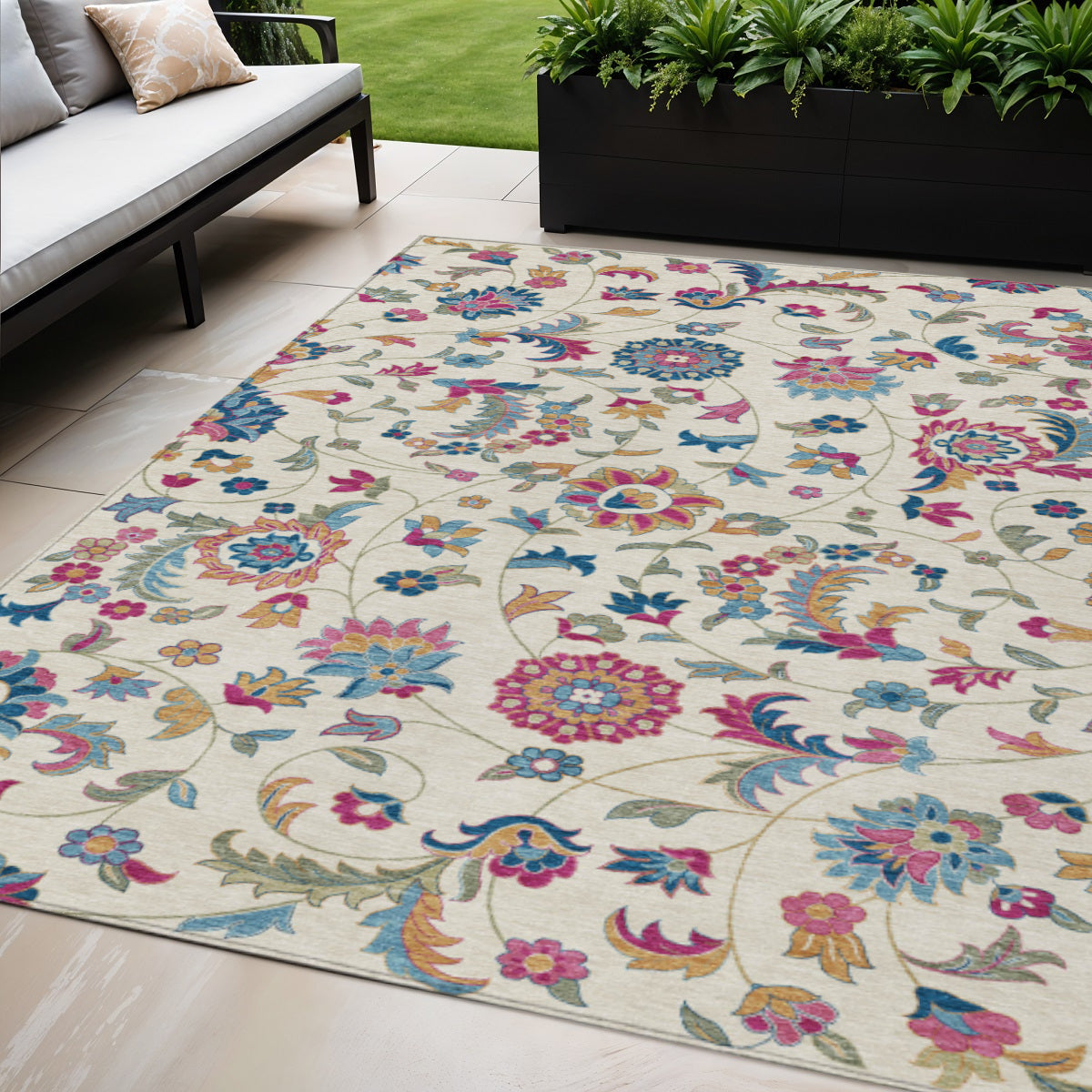 5' X 8' Linen Pink And Denim Blue Floral Washable Indoor Outdoor Area Rug