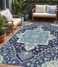 5' X 8' Navy Blue Ivory And Black Oriental Washable Indoor Outdoor Area Rug