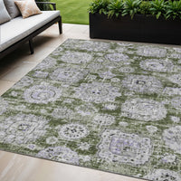 5' X 8' Olive Green And Gray Floral Washable Indoor Outdoor Area Rug