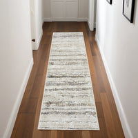 This 8-foot cream and gray abstract non skid runner rug, is a great way to add warmth to a room. Ideal for spaces with kids and pets, this rug is stain resistant to help repel dirt and spilled liquids. Built to last, this rug crafted from polyester fibers is known for its durability and long lasting appeal. Rugs are a great way to showcase your style, hide imperfections, warm your home and reduce noise. This rectangular shaped rug features a abstract design that will add a functional and decorative accent to your space. This modern styled runners makes a great accent for the hallway, in front of cabinets, in the laundry room, or any other space you need a narrow and long rug. 27-inch h x 90-inch w x 0.39-inch d