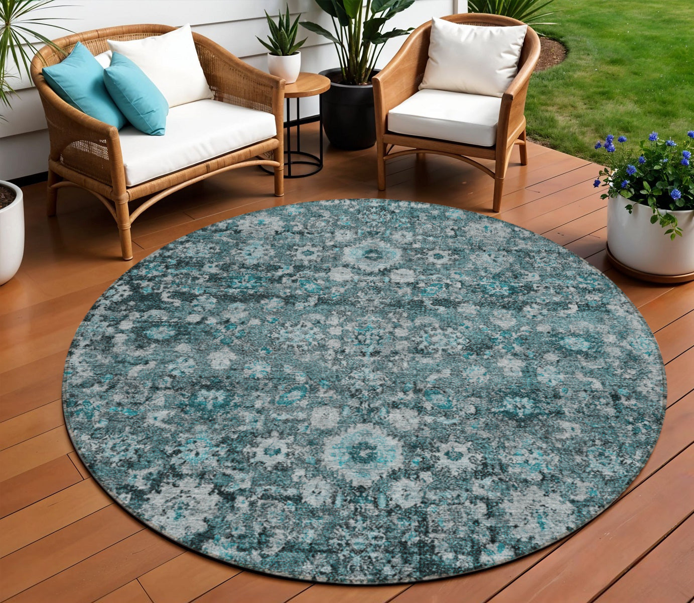 8' Dark Green Aqua And Charcoal Round Oriental Washable Indoor Outdoor Area Rug