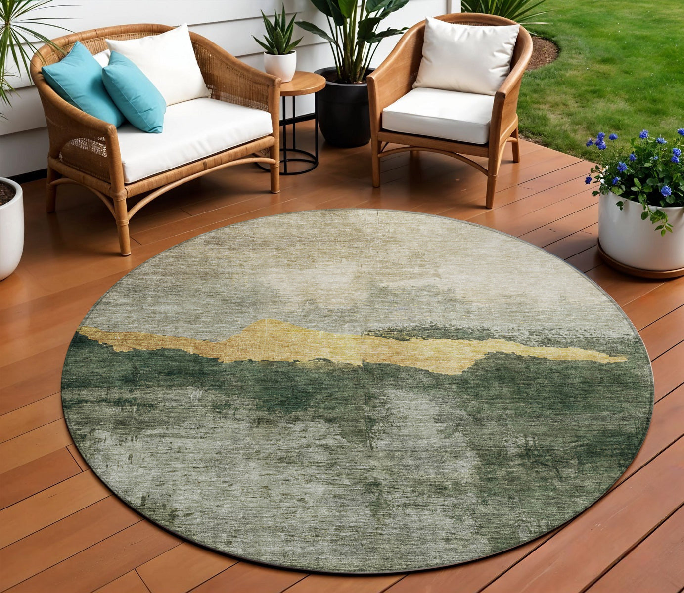 8' Fern Green Gold And Gray Round Abstract Washable Indoor Outdoor Area Rug