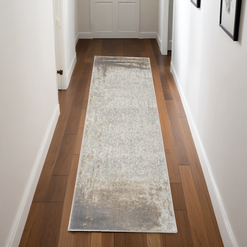 Add some artistry to your room with this 8-foot gray and ivory abstract non skid runner rug. Ideal for spaces with kids and pets, this rug is stain resistant to help repel dirt and spilled liquids. Built to last, this rug crafted from polypropylene fibers is known for its durability and long lasting appeal. Rugs are a great way to showcase your style, hide imperfections, warm your home and reduce noise. This rectangular shaped rug features a abstract design that will add a functional and decorative accent to your space. This modern styled runners makes a great accent for the hallway, in front of cabinets, in the laundry room, or any other space you need a narrow and long rug. 27-inch h x 90-inch w x 0.25-inch d