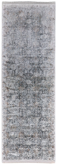 8' Gray and Silver Damask Power Loom Worn Faded Runner Rug