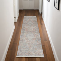 8' Gray Ivory and Orange Oriental Power Loom Worn Faded Runner Rug With Fringe