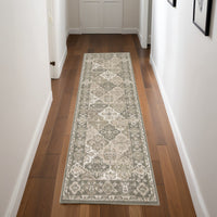 This 8-foot green and ivory medallion distressed runner rug, is a great way to add warmth to a room. Built to last, this rug crafted from polypropylene fibers is known for its durability and long lasting appeal. Rugs are a great way to showcase your style, hide imperfections, warm your home and reduce noise. This rectangular shaped rug features a abstract design that will add a functional and decorative accent to your space. This traditional style runner makes a great accent for the hallway, in front of cabinets, in the laundry room, or any other space you need a narrow and long rug. 27-inch h x 90-inch w x 0.5-inch d.