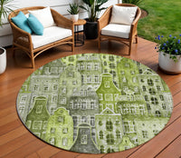 8' Green And Lime Green Round Village Houses Washable Indoor Outdoor Area Rug