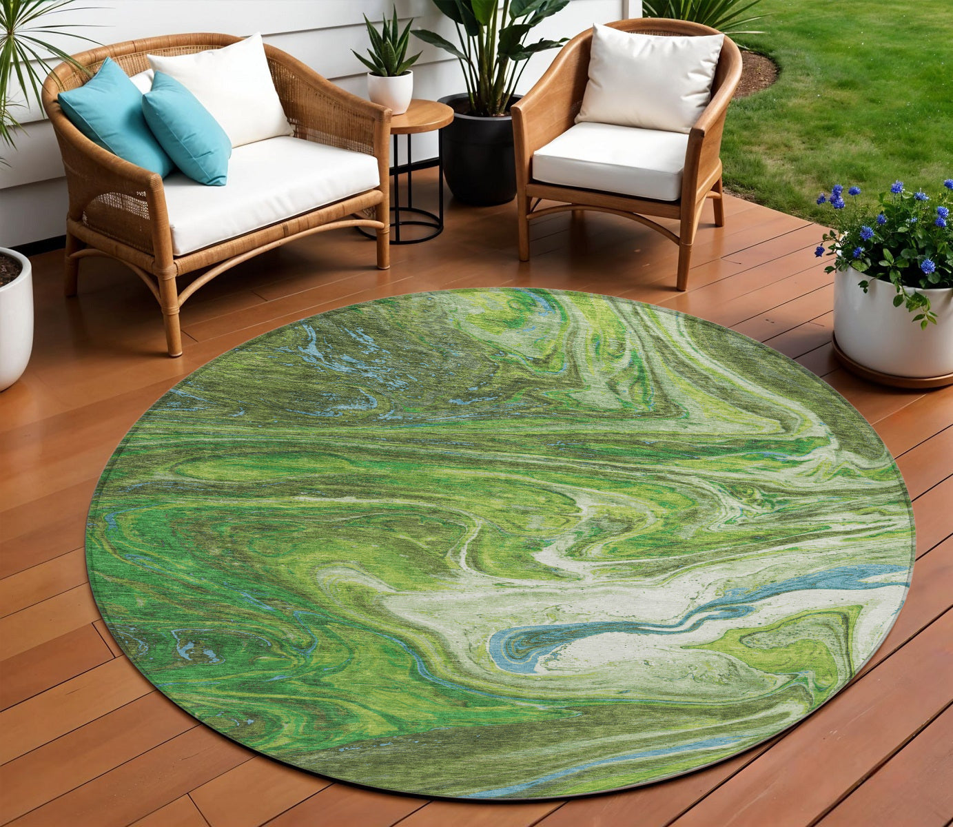 8' Green Blue And Ivory Round Abstract Washable Indoor Outdoor Area Rug