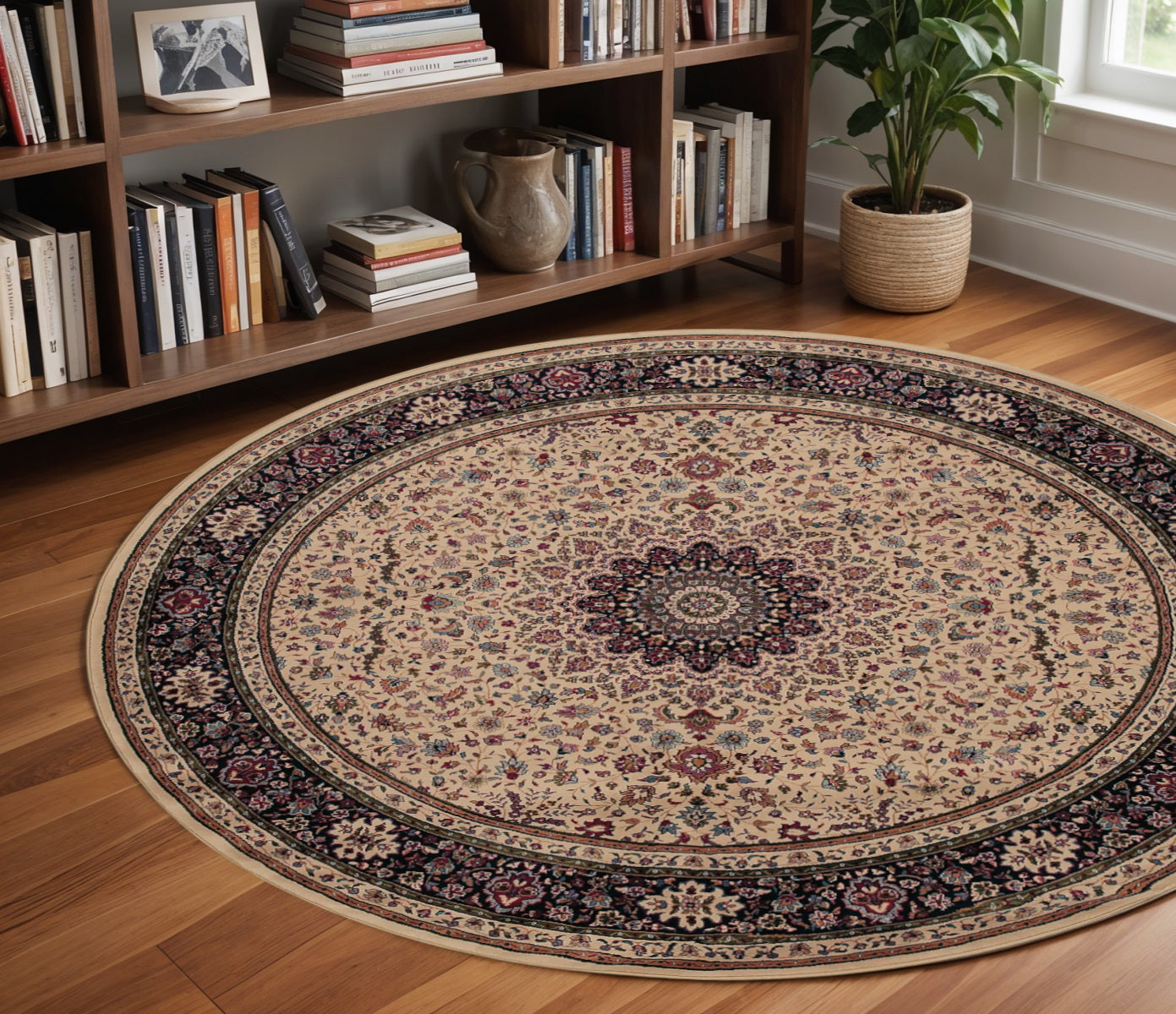 Set an inviting tone in your space with this 8-foot ivory black and red oriental round rug. Ideal for spaces with kids and pets, this rug is stain resistant to help repel dirt and spilled liquids. Built to last, this rug crafted from polypropylene fibers is known for its durability and long lasting appeal. Rugs are a great way to showcase your style, hide imperfections, warm your home and reduce noise. This geometric round shaped rug features a oriental pattern in ivory, black, and red that combines a good looking print with a unique and updated shape. The mix of shape, color, and design gives this rug refreshing visual interest. This larger sized, traditional styled rug is ready to create a focal point or statement piece in your room. 94.49-inch h x 94.49-inch w x 0.43-inch d.