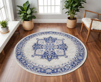 This 8-foot ivory and blue floral round rug, is a great way to add warmth to a room. Ideal for spaces with kids and pets, this rug is stain resistant to help repel dirt and spilled liquids. Built to last, this rug crafted from polyester fibers is known for its durability and long lasting appeal. Rugs are a great way to showcase your style, hide imperfections, warm your home and reduce noise. This geometric round shaped rug features a floral pattern in ivory and blue that combines a good looking print with a unique and updated shape. The mix of shape, color, and design gives this rug refreshing visual interest. This larger sized, cottage styled rug is ready to create a focal point or statement piece in your room. 96-inch h x 96-inch w x 0.39-inch d.