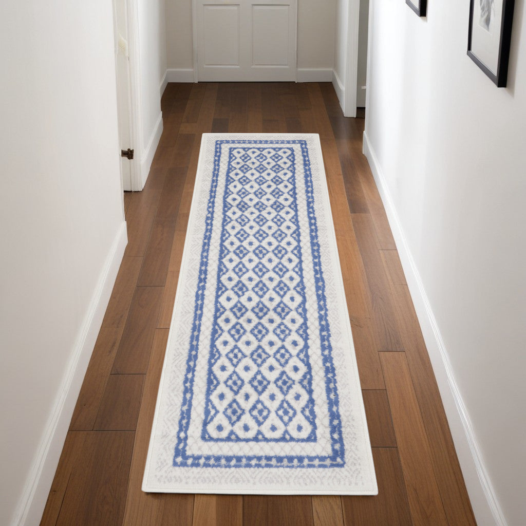 8' Ivory and Blue Geometric Distressed Non Skid Runner Rug