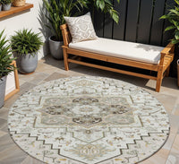8' Ivory And Brown Round Oriental Washable Indoor Outdoor Area Rug