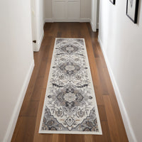 8' Ivory Black and Gray Floral Medallion Non Skid Runner Rug