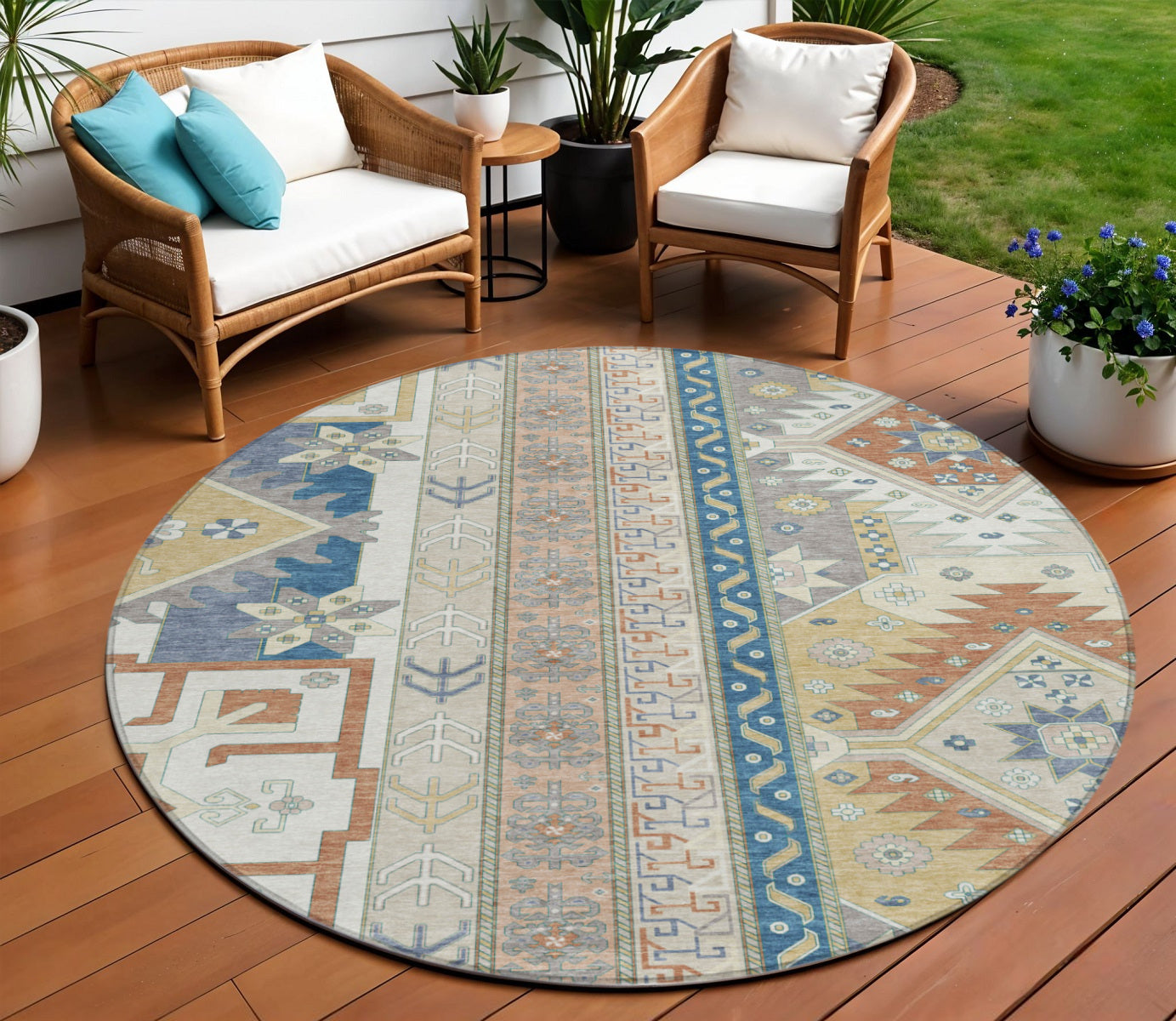 Add great coloration and comfortable texture to your space with this 8-foot ivory blue and brown round aztec washable indoor outdoor area rug. This geometric round shaped rug features a aztec pattern in ivory, blue, and brown that combines a good looking print with a unique and updated shape. The mix of shape, color, and design gives this rug refreshing visual interest. Ideal for outdoor spaces or high traffic areas with kids and pets, this rug is made from heavy duty polyester that is stain resistant to help repel water, dirt, and stains. Versatile in use, durable, and easy to maintain, this rug is an ideal solution to add a decorative and inviting touch to your indoor or outdoor space. 96-inch h x 96-inch w x 0.19-inch d.