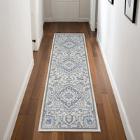 Add some artistry to your room with this 8-foot ivory blue and gray floral non skid runner rug. Ideal for spaces with kids and pets, this rug is stain resistant to help repel dirt and spilled liquids. Built to last, this rug crafted from polypropylene fibers is known for its durability and long lasting appeal. Rugs are a great way to showcase your style, hide imperfections, warm your home and reduce noise. This rectangular shaped rug features a abstract design that will add a functional and decorative accent to your space. This bohemian styled runners makes a great accent for the hallway, in front of cabinets, in the laundry room, or any other space you need a narrow and long rug. 27-inch h x 90-inch w x 0.25-inch d
