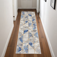 8' Ivory Blue and Gray Geometric Non Skid Runner Rug