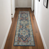 8' Ivory Blue and Orange Floral Distressed Non Skid Runner Rug