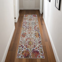 8' Ivory Gray and Orange Floral Distressed Non Skid Runner Rug