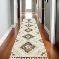 8' Ivory Gray And Red Southwestern Shag Runner Rug With Fringe