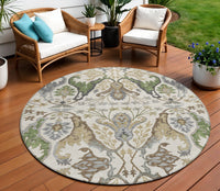 8' Ivory Green And Brown Round Floral Washable Indoor Outdoor Area Rug
