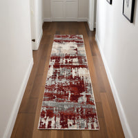 8' Ivory Red and Gray Abstract Non Skid Runner Rug