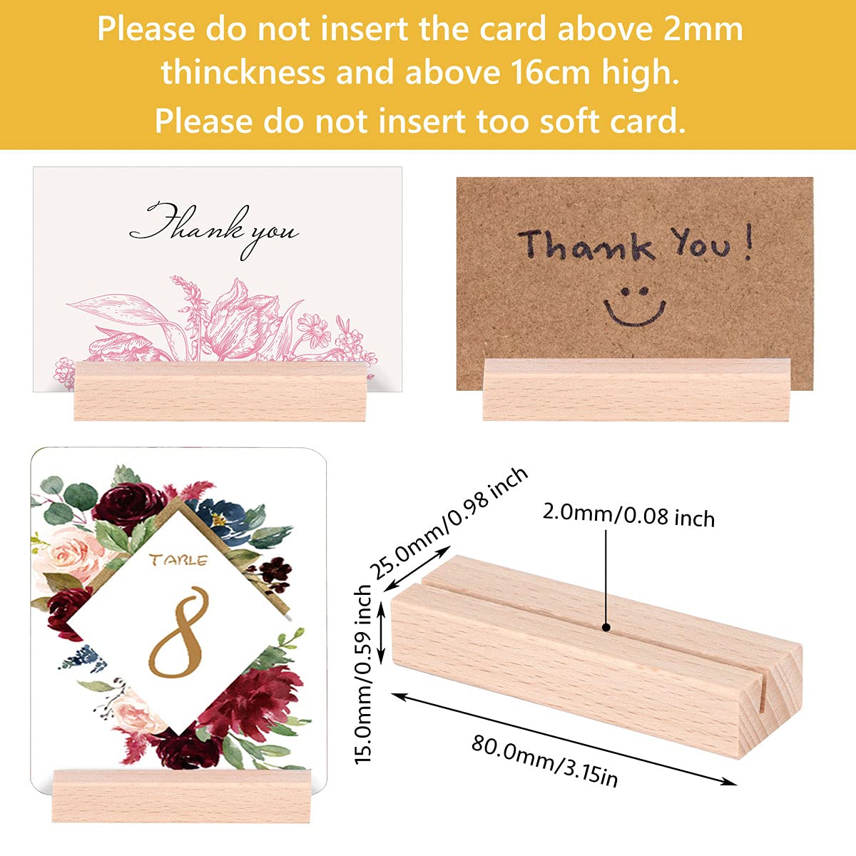 Q: What is the maximum card thickness and height that can be used with these holders?A: The wooden place card holders are designed to accommodate cards with a maximum thickness of 2 mm and a height of 16 cm, ensuring a secure fit.